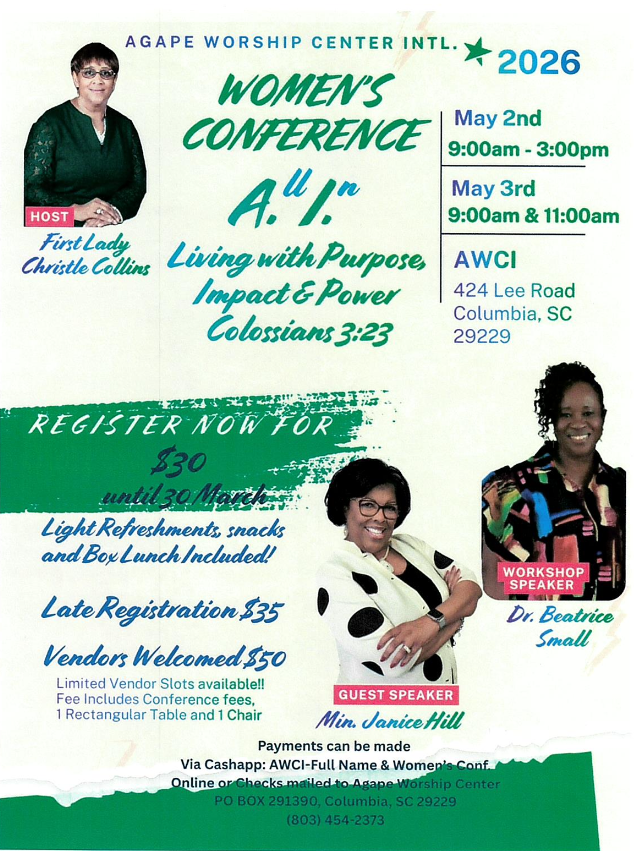 Agape Worship Center International, Church of God, warmly invites you to join us for the 2026 AWCI Women’s Conference—a powerful weekend of worship, fellowship, and transformation.